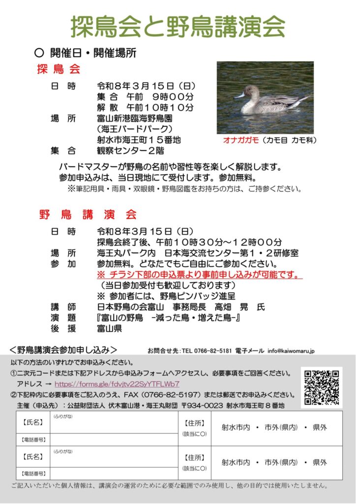 ※筆記用具・雨具・双眼鏡・野鳥図鑑をお持ちの方は、ご持参ください。
