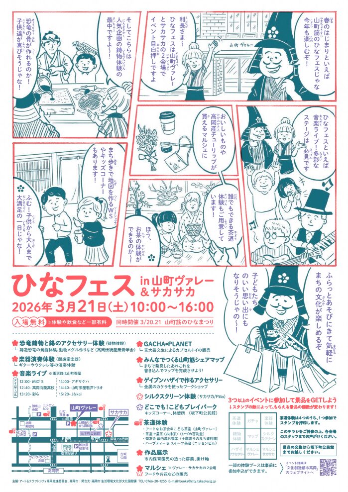 土蔵造りのまち並みが残る山町筋に面した「山町ヴァレー」と、万葉線坂下町電停すぐのちいさな商店街「サカサカ」で、気軽に文化を楽しめるイベントを開催