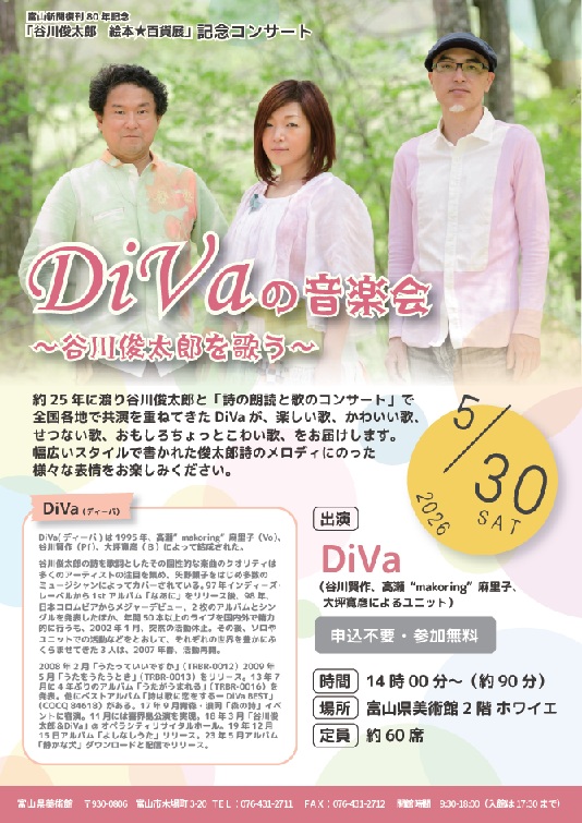 約25年に渡り谷川俊太郎と「詩の朗読と歌のコンサート」で全国各地で共演を重ねてきたDivaが、楽しい歌、かわいい歌、せつない歌、おもしろちょっとこわい歌、をお届けします。会場の出入り自由、開放的な場所での開催なので、小さなお子様連れでも気軽にご来場ください!