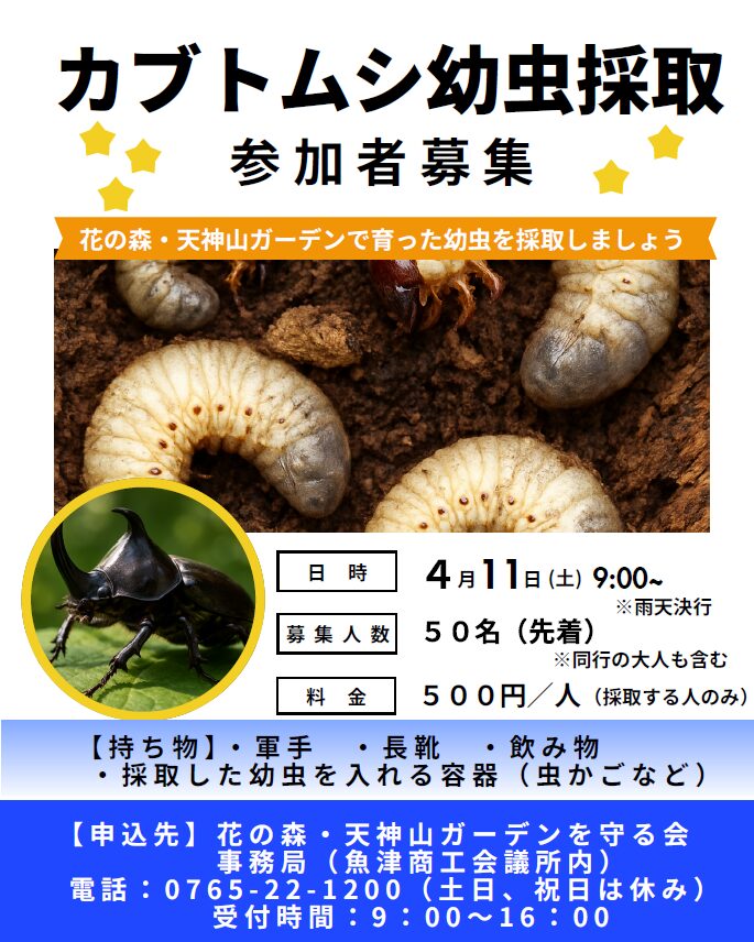 【持ち物】 軍手・長靴・飲み物(熱中症対策)・採取した幼虫を入れる容器(虫かごなど)