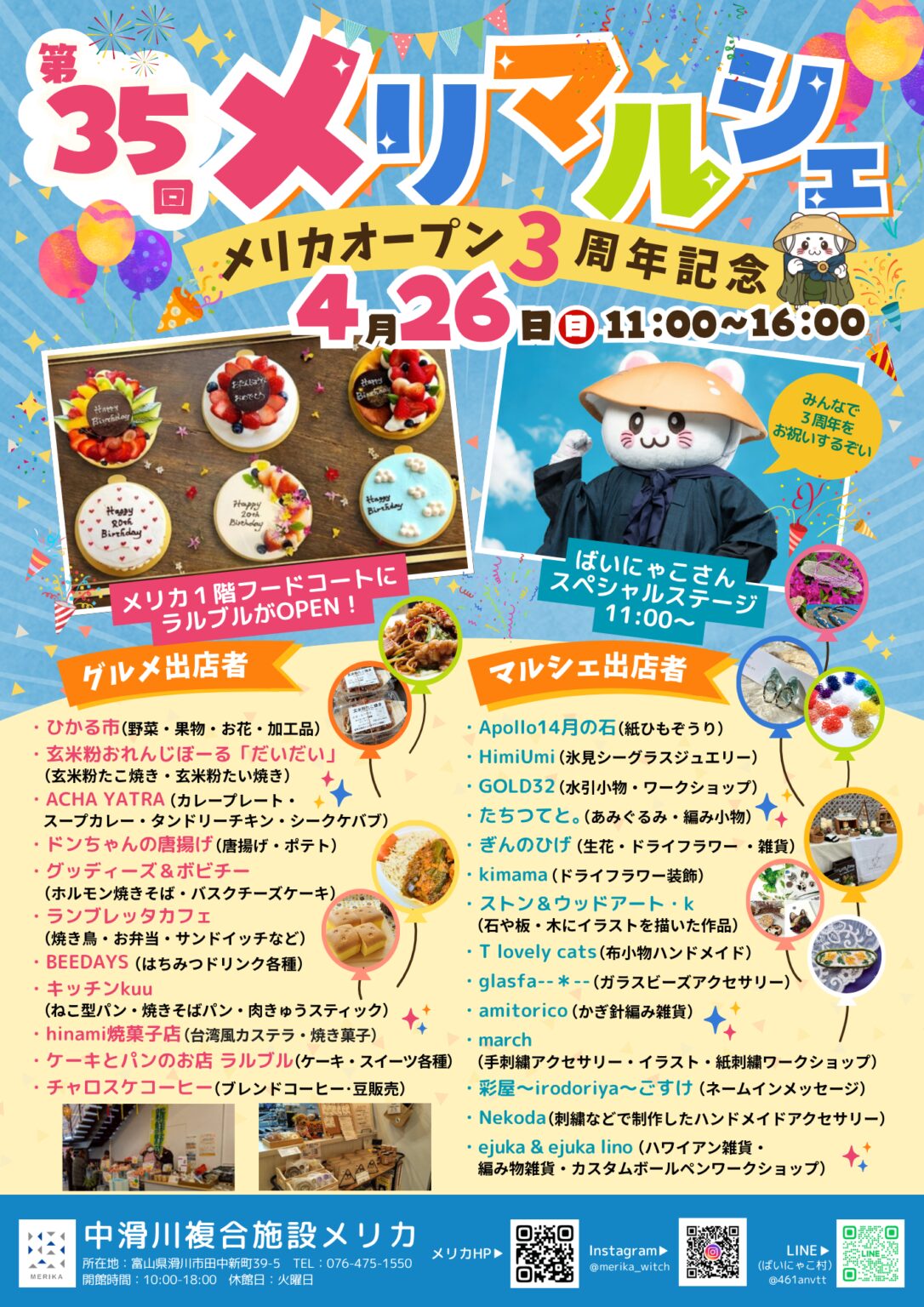 開催前 滑川市 0〜2歳 3〜6歳 小学1〜3年 小学4〜6年 4月26日(日) 11時~16時 第35回 メリマルシェ/メリカ3周年 中滑川複合施設メリカ メリカ3周年を祝し、恒例のメリマルシェを開催。ハンドメイドや物販などのマルシェ、フード出店¥/入場無料 https://merika.org/event/2026%E5%B9%B44%E6%9C%8826%E6%97%A5%E6%97%A5-%E7%AC%AC35%E5%9B%9E-%E3%83%A1%E3%83%AA%E3%83%9E%E3%83%AB%E3%82%B7%E3%82%A7-%E3%83%A1%E3%83%AA%E3%82%AB3%E5%91%A8%E5%B9%B4%EF%BC%8811-16%E6%99%82/
