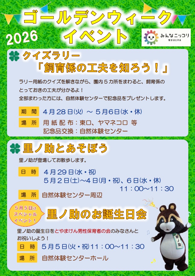 開催前 富山市 0〜2歳 3〜6歳 小学1〜3年 小学4〜6年 4月28日(火)~5月6日(水・振休) ゴールデンウィークイベント 富山市ファミリーパーク クイズラリー里ノ助と遊ぼうヒツジの毛刈り https://www.toyama-familypark.jp/10866