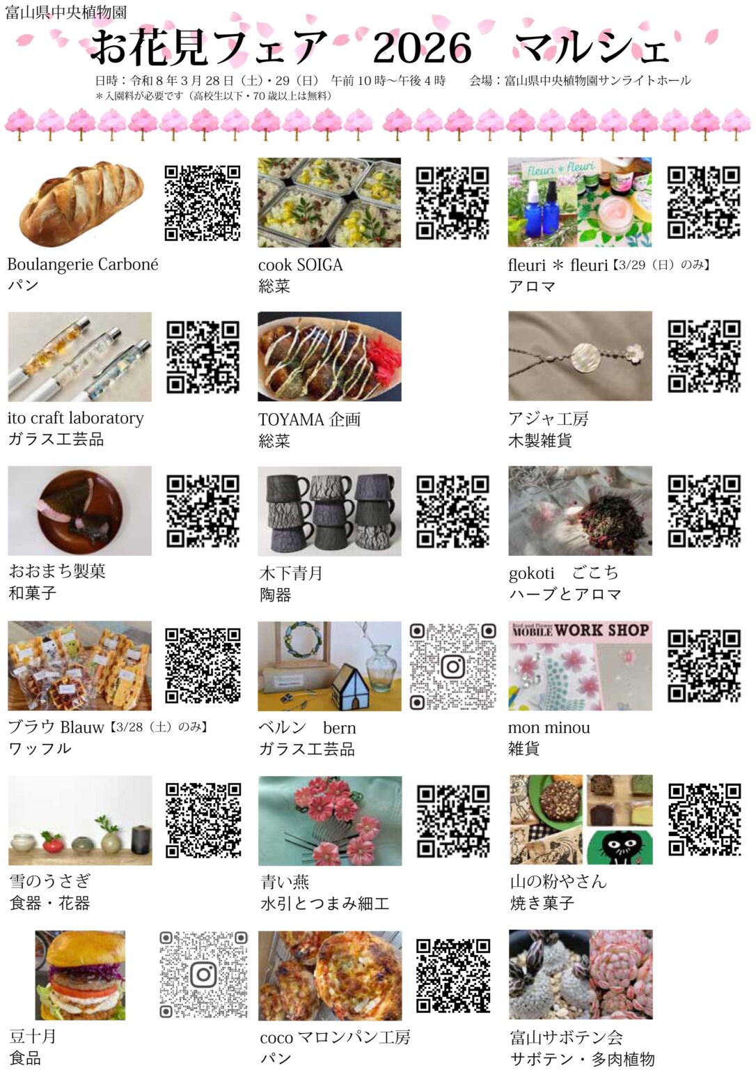開催前 富山市 0〜2歳 3〜6歳 小学1〜3年 小学4〜6年 3月28日(土)・29日(日) 10時~16時 さくらマルシェ 富山県中央植物園 3月20日(金・祝)~4月15日(水)までのお花見フェアの関連イベント。お花見にぴったりのマルシェが勢揃い♪ショーやスタンプラリーも同時開催しています。 https://www.bgtym.org/news/12839/