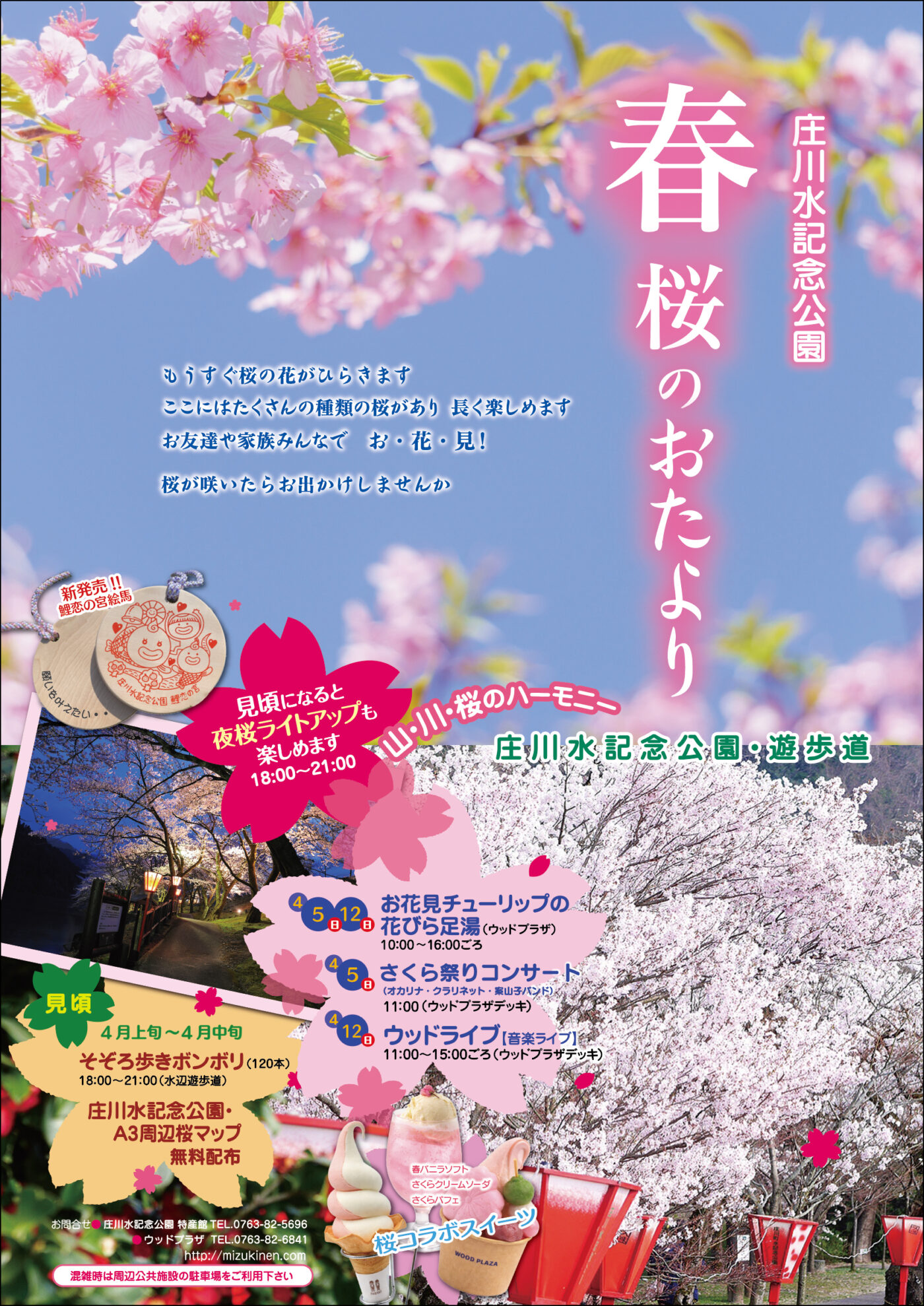 庄川水記念公園周辺にはたくさんの種類の桜があり、長く楽しめます。
