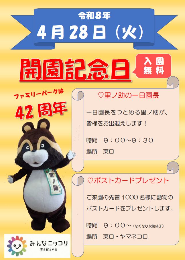 開催前 富山市 0〜2歳 3〜6歳 小学1〜3年 小学4〜6年 4月28日(火) 開園記念日 富山市ファミリーパーク 4月28日(火)は入園無料! 里ノ助が一日園長をつとめます。ポストカードプレゼント(先着1000名様) https://www.toyama-familypark.jp/11008
