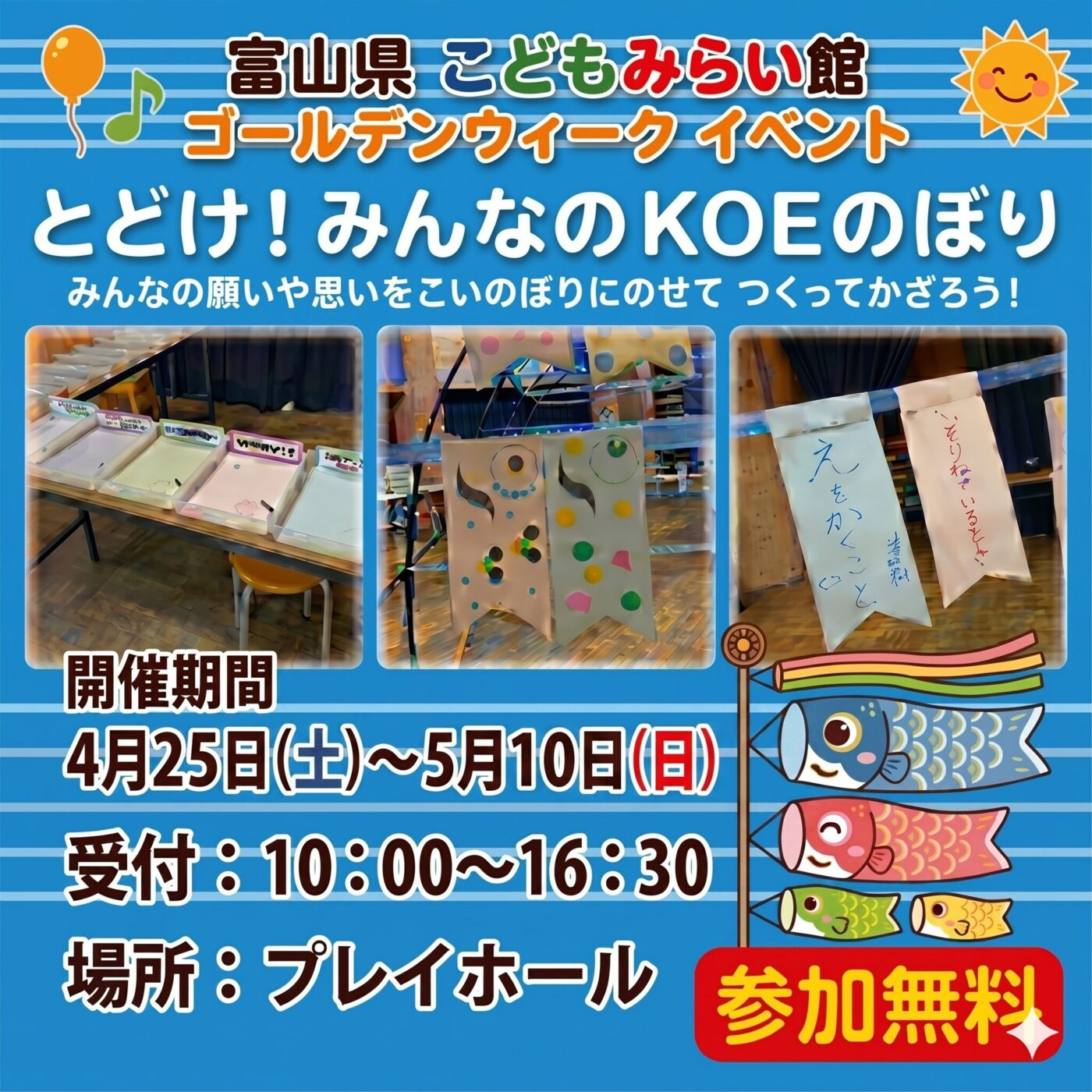 もうすぐ、こどもの日! みんなの思いや願いをこいのぼりにのせて、こどもみらい館にかざろう!