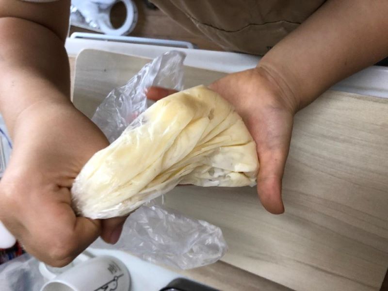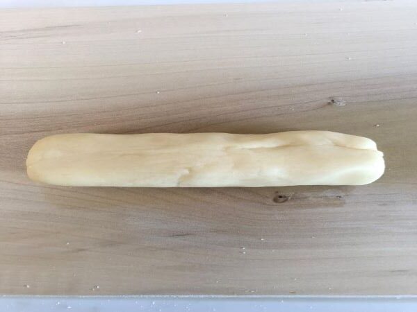 生地を棒状に整えて、ポリ袋から取り出します。袋の中で形を整えるのが難しい場合は、袋から取り出して棒状に整えてください。