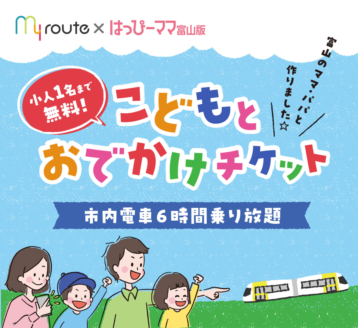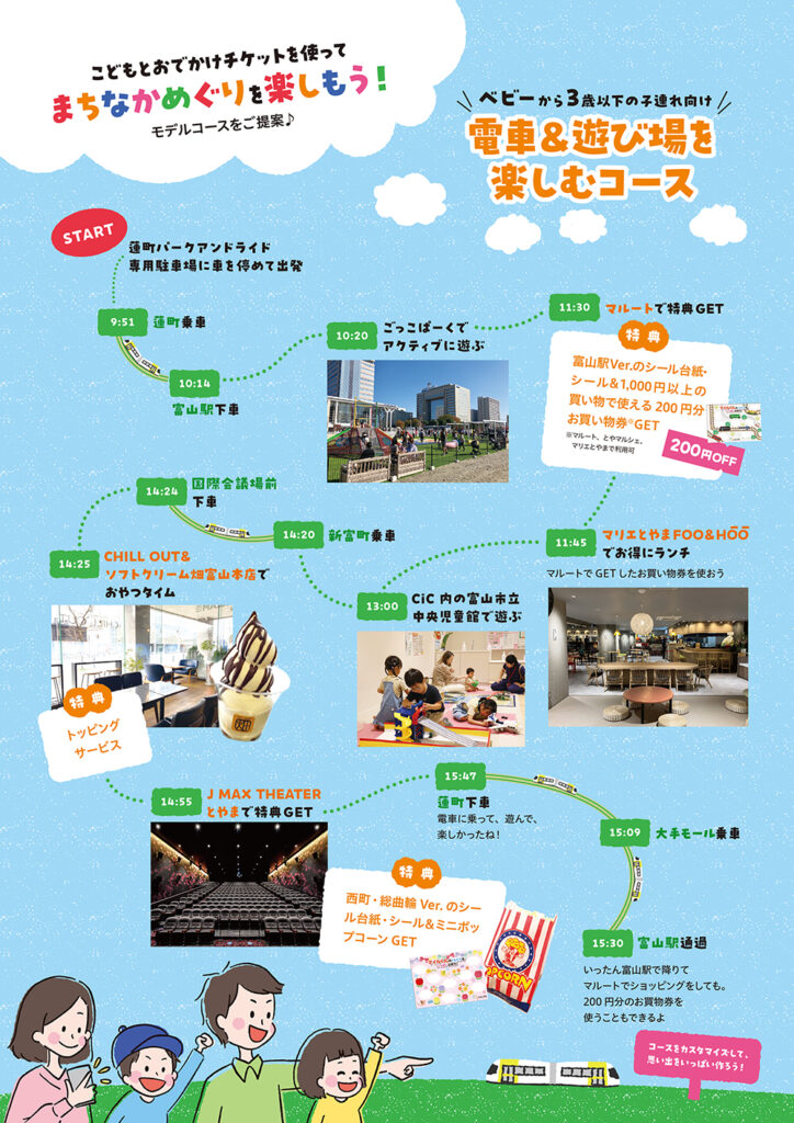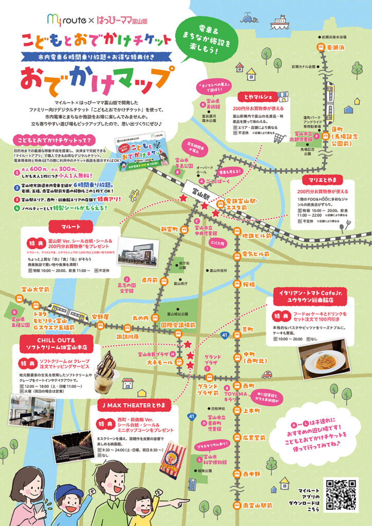 「こどもとおでかけチケット」は、おでかけアプリ「マイルート」とはっぴーママ富山版がタッグを組んで