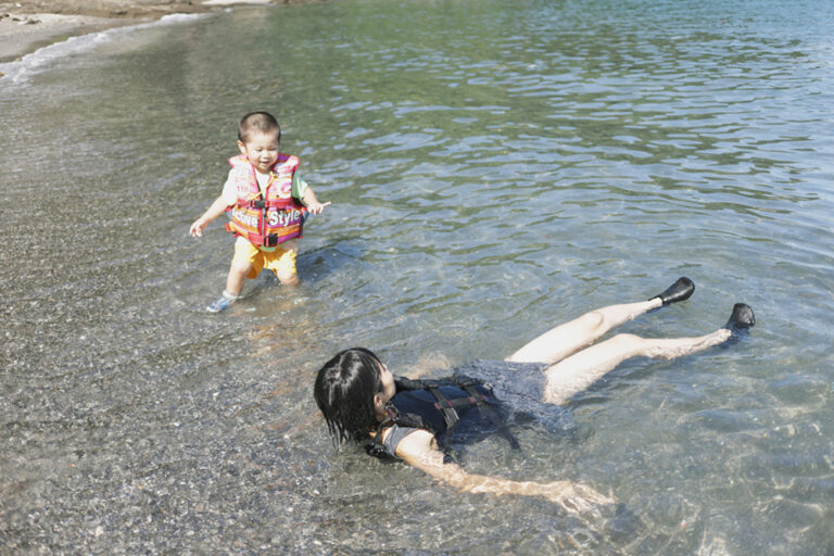 海へは大人が先に入り、沖の深い側にいるようにして、子どもから絶対に目を離さず手の届くところにいるようにしましょう。フロート遊具は年齢に合ったサイズを使い、大人が持った状態で遊びます。