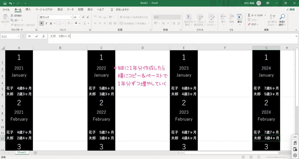 3:12か月分できたら、コピー&ペーストで数年分を作成する