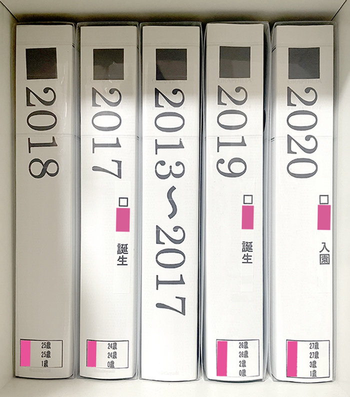 例えば、「太郎 幼稚園入園」や「親戚 結婚」など大きなイベントが表紙に書いてあるとその写真を見返したくなった時に毎回中を見て確認しなくても、すぐに見つけ出すことができます。また、忘れがちなのは「あれ? 私って何歳だっけ?」ということ。表紙に書いておくと便利でした。