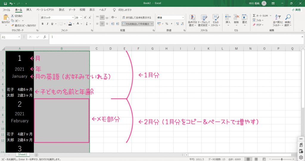 1:Excelのセルに「月」「年」「月の英語(お好みで)」「子どもの年齢」「メモ部分」を作成