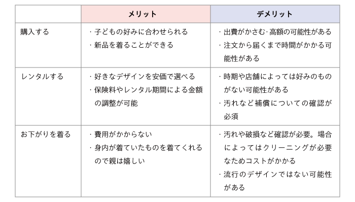 せっかくなので和装をと思う方は多いと思います。着物と小物は、いずれも購入する・レンタルする・お下がりを着るという方法が挙げられます。それぞれ注意点など異なりますので表にまとめてみました。