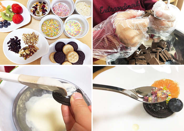 - 溶けたチョコレートを、クッキーやフルーツにかける。