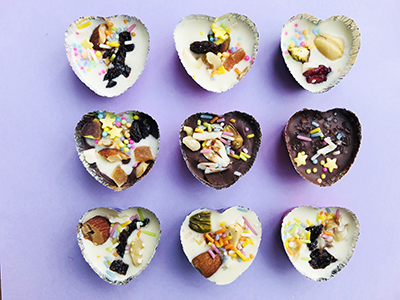 まだクッキーやフルーツを手に持つことが難しい場合は、大人が溶かしたチョコレートをアルミカップに流し入れて、そこにトッピングをしてもらうのもいいですよ。