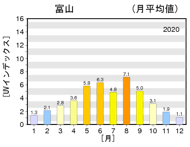 「日最大UVインデックス(解析値)の年間推移グラフ 2020年 富山」(気象庁ホームページより)