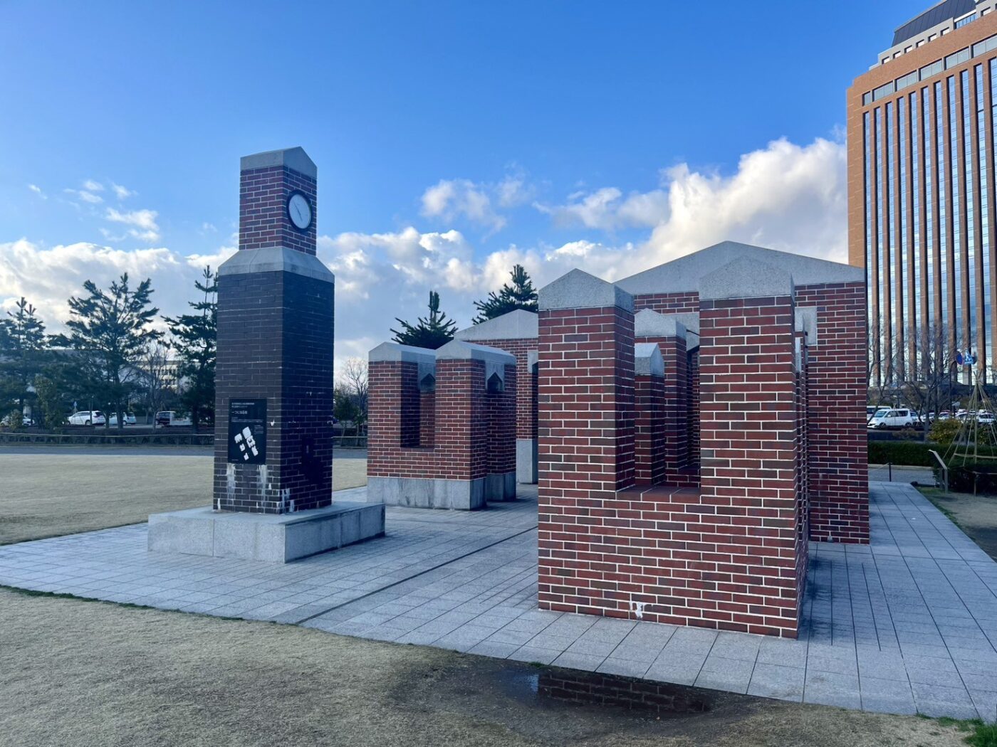 芝生にあるレンガ造りのモニュメントは、時計台でもあり、子どもたちの遊び場でもあります。