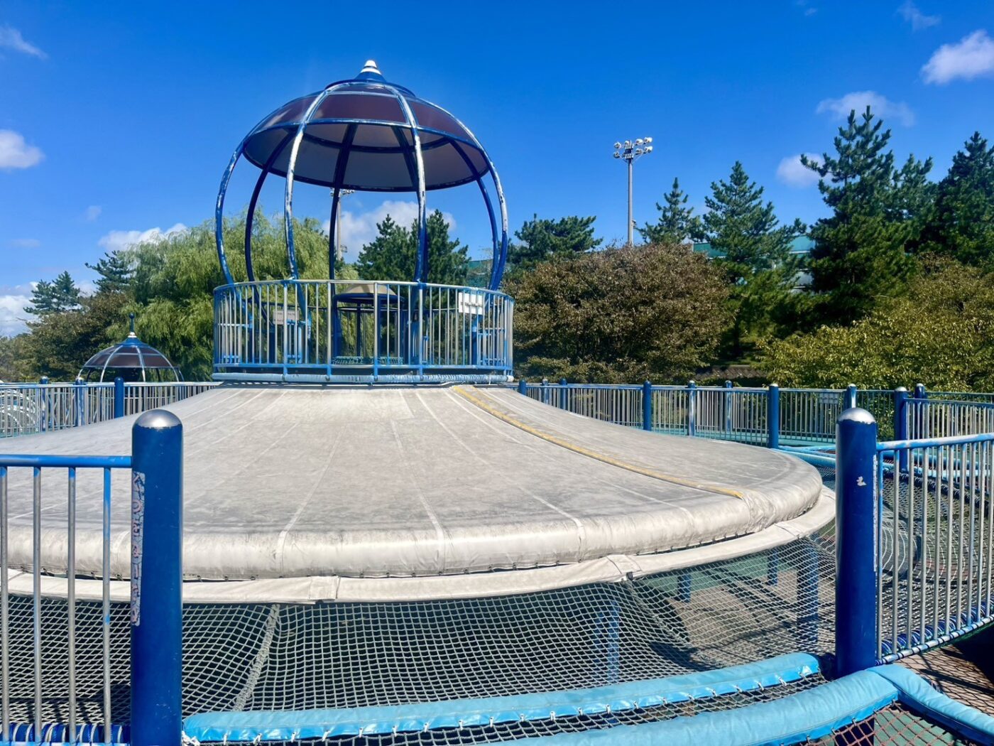「海底都市」がモチーフの大型遊具には、UFOのような巨大トランポリンをはじめ、ネットのトンネルやロープ上り、ブランコなどが組み合わされています。
