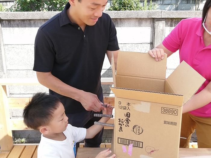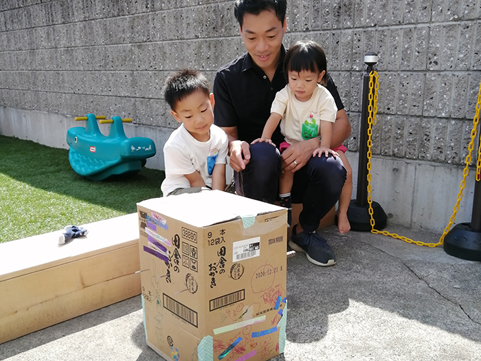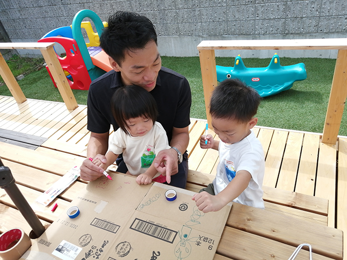 1.段ボールを組み立てた後、サインペン、マスキングテープなどで側面をデコレーション! サインペンは油性のほうが描きやすいし濡れた場合もにじみません。デコレーション前に、家族でテーマを決めたりして話し合いながら楽しくデコレーションしましょう♪