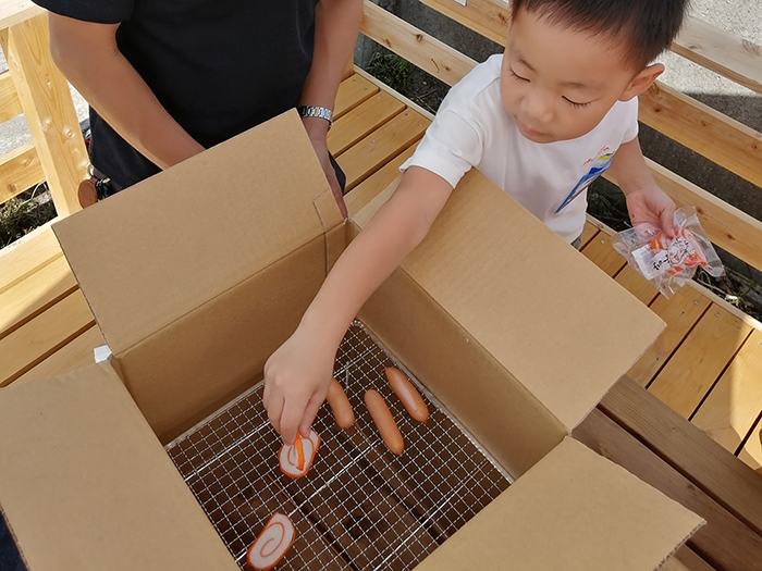 4.煙が立ったら食材を並べた段ボールを上からかぶせて完成~!あとは待つだけです…★ 目安として、6Pチーズは30分ほどでおいしいスモークチーズになりました!